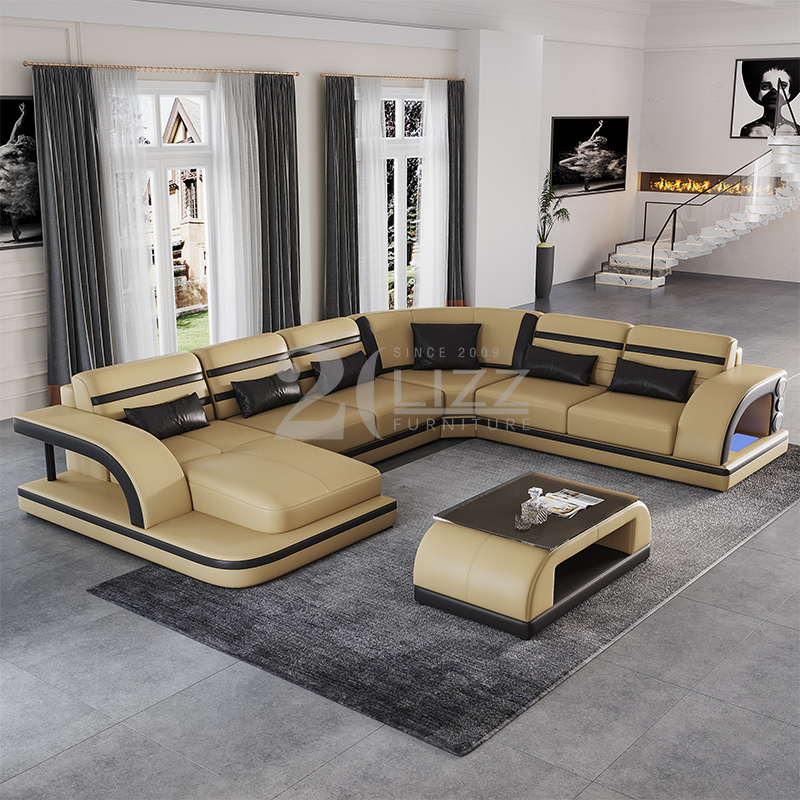 Esta interpretação moderna do sofá-chesterfield de lounge secional intemporal vem com encosto de cabeça ajustável, luzes remotas de LED em ambos os haterrests. Mesa de centro e suporte de TV é opcional para combinar com o sofá, a mesa de café e o suporte de TV vem com luz LED. Está disponível em cinza, bege, marrom e todas as outras cores que você precisa para fazer uma moderna sala de estar para você. Design popular com qualidade maravilhosa e funções incríveis.