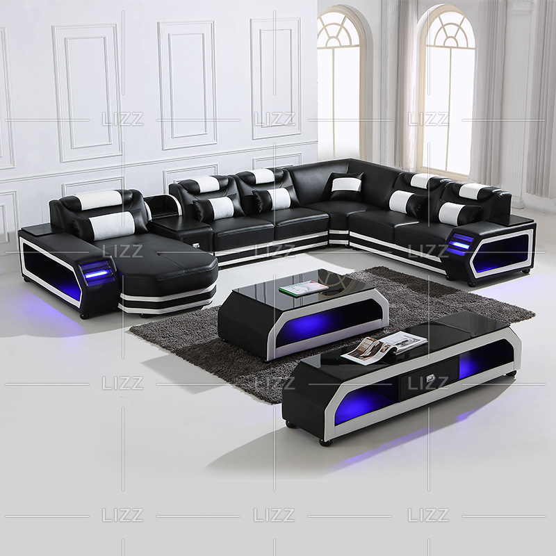 Conjunto completo Especificação:(1 * l / r 3s com braço + canto + tabela média de 2s + armas +L / r.Chaise + mesa de café + suporte de TV),6Lance travesseiros, luz LED com o interruptor.